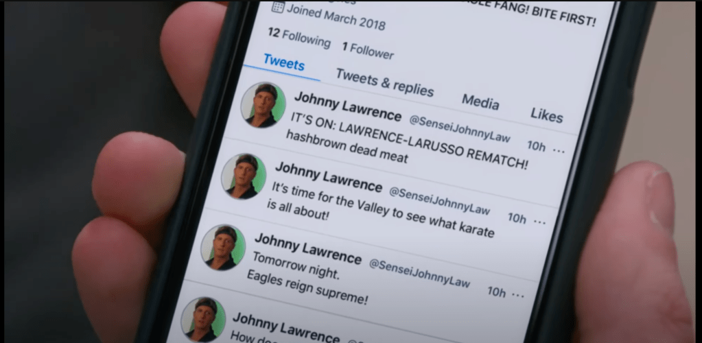Johnny’s Tweets on Cobra Kai. Notice he only has one follower; it’s revealed to be Miguel. Screenshot/Now Playing via YouTube